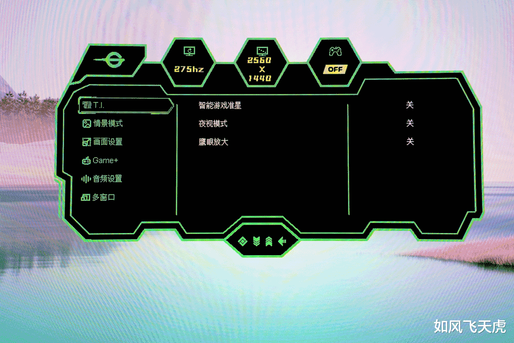 菜单是绿色的,最上方有显示器的帧率、分辨率、以及是否接有手柄。下方的标记则是4个按键在当前菜单的作用。菜单分为三级,第一级菜单分别有T.I、情景模式、画面设置、Game+、音频设置、多窗口、输入/输出设置、系统设置。