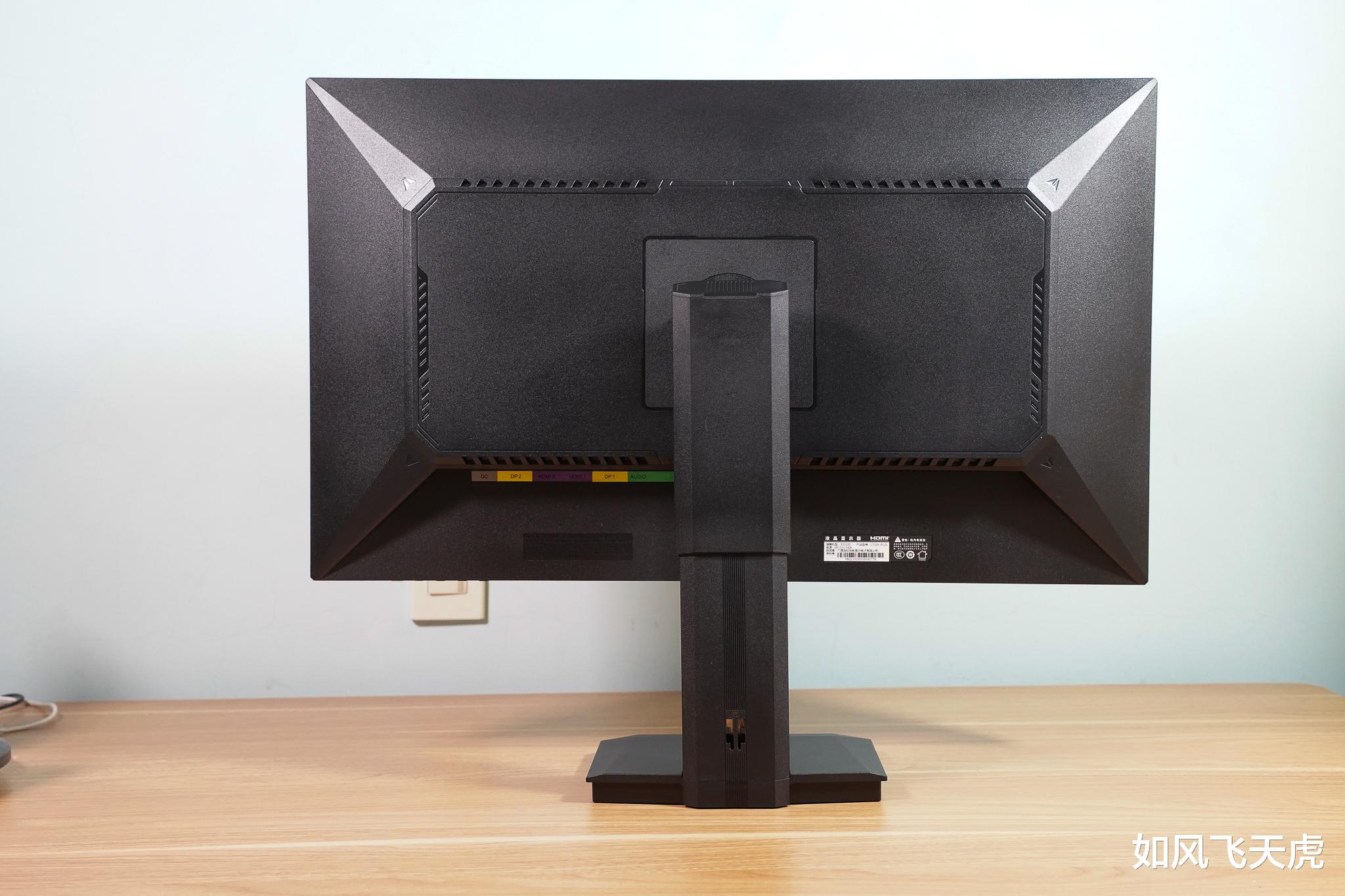 从背面看是泰坦军团一贯的风格。带有斜切刻面,给人立体的感觉,棱角分明的线条与电竞定位相契合。显示器背部采用了VESA 100×100mm标准孔位,所以可以轻松支持壁挂安装或者机械臂安装。支架采用免工具快拆设计,安装时对准卡扣下压即可完成,拆卸时拨动底部开关即分离。背板左侧可以看见有彩色标识,哪里是接口的所在。