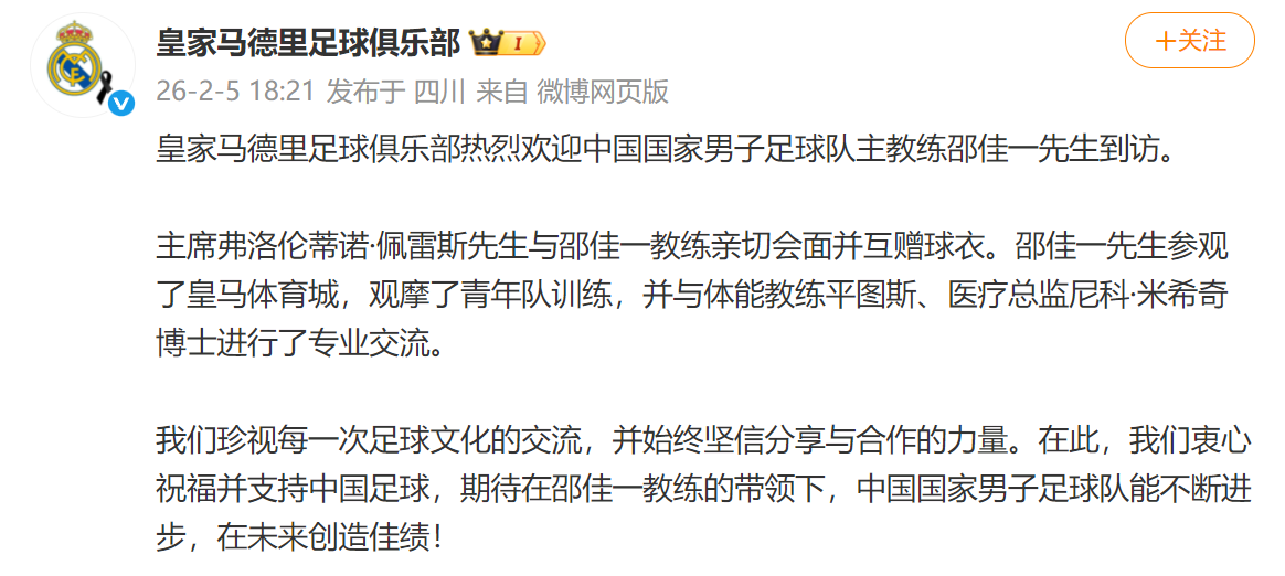 皇马官方更是直言,珍视每一次足球文化的交流,坚信分享与合作的力量,并衷心祝福中国足球在邵佳一的带领下稳步进步、再创佳绩。