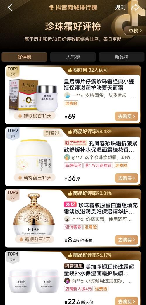 榜单战绩:抖音商城珍珠霜好评榜TOP2核心卖点:古方珍珠粉+现代科技配方,30+干皮淡化干纹细纹