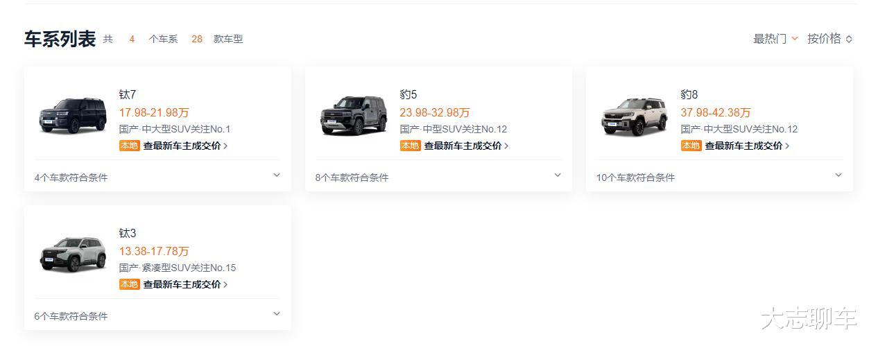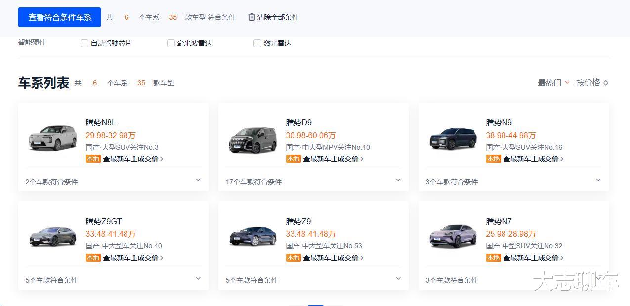 除此之外,比亚迪对于腾势的重视程度也比较高,你发现了没有?相较于方程豹来说,腾势在新车型的投入方面是比较多的,方程豹的车型也就4款车,豹5、豹8、钛7和钛3这四款车,而腾势则有6个车系,足足35款车型,啥概念?相当于腾势在资源投入方面,是受到比亚迪比较重视的存在,可见腾势的品牌力还算是比较不错的。