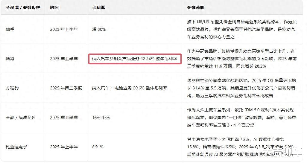 最典型的地方,就是毛利率方面了,相较于王朝网和海洋网16%-18%的毛利率来,腾势的毛利率整体上能达到18.24%,比起方程豹20.6%和仰望系列30%以上的毛利率而言,似乎腾势的毛利并不高,因此,这也是很多人对此并不怎么重视腾势的原因,毕竟这可是中高端品牌,结果,利润居然连王朝网和海洋网一半都达不到。