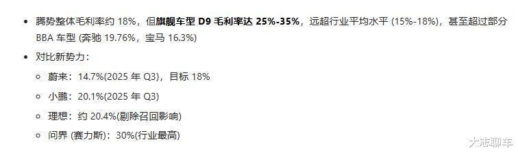 再然后,就是毛利率方面,很多人只看到了他整体毛利率才18.4%,却忽略了腾势主推的旗舰车型腾势D9毛利率是25%以上,远超行业里面的平均水平,甚至隔壁大吹特吹的BAA,奔驰才19.76%,宝马更是才16.3%,哪怕是把其他车企都给算上,腾势也依然是佼佼者,属于毛利比较靠前的那种,而之所以造成只有18%毛利,也是被其他车型给拉了一把。