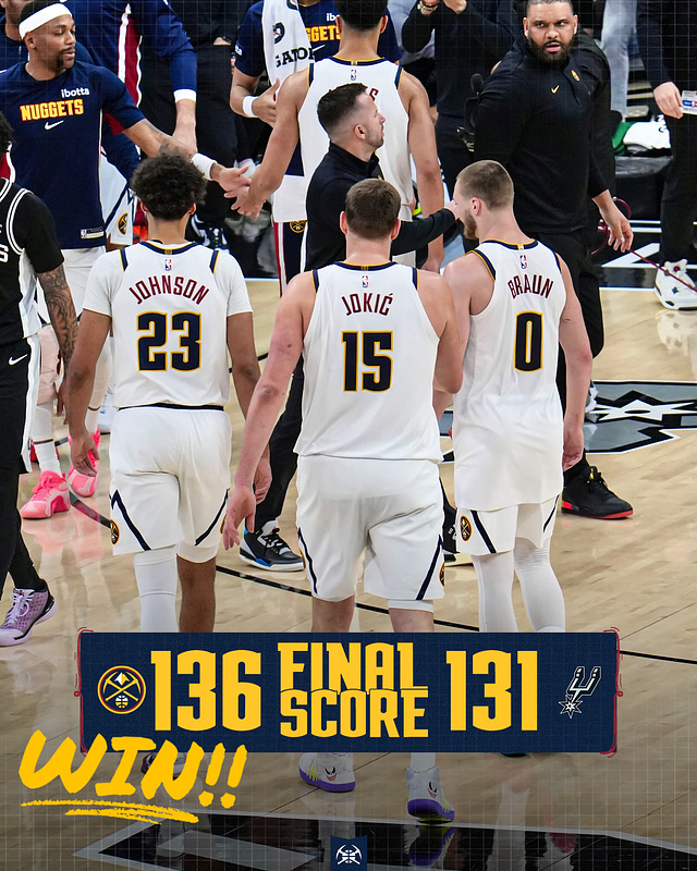 在昨天38分大胜火箭之后,掘金今天又背靠背在客场完成20分大逆转,以136-131险胜马刺,掘金取得两连胜,战绩来到41胜26负,暂时排名西部第五,与火箭和湖人已经没有胜场差。马刺五连胜遭终结,战绩来到48胜18负,继续排在西部第二位。虽然今天输给了掘金,但马刺本赛季面对雷霆、火箭、湖人和掘金这四支西部球队还是取得11胜4负的傲人战绩。