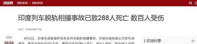 2、环球网《印度列车脱轨相撞事故已致288人死亡 数百人受伤》