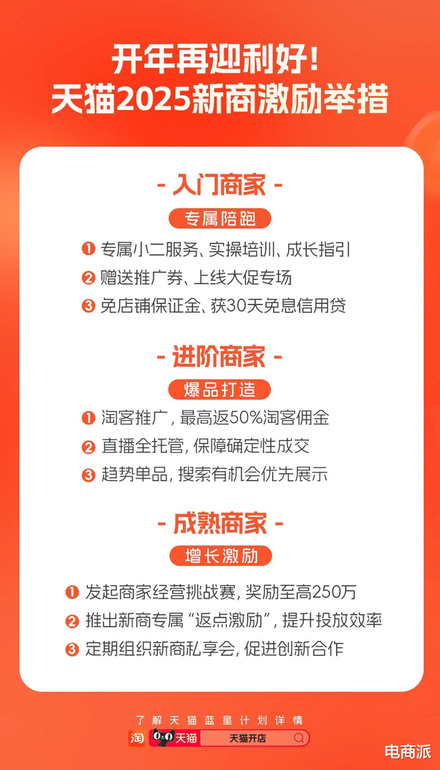 针对这些问题,淘宝天猫推出的“蓝星计划”,为不同类型的优质新商家提供15项“商家培育”及“经营激励”扶持。