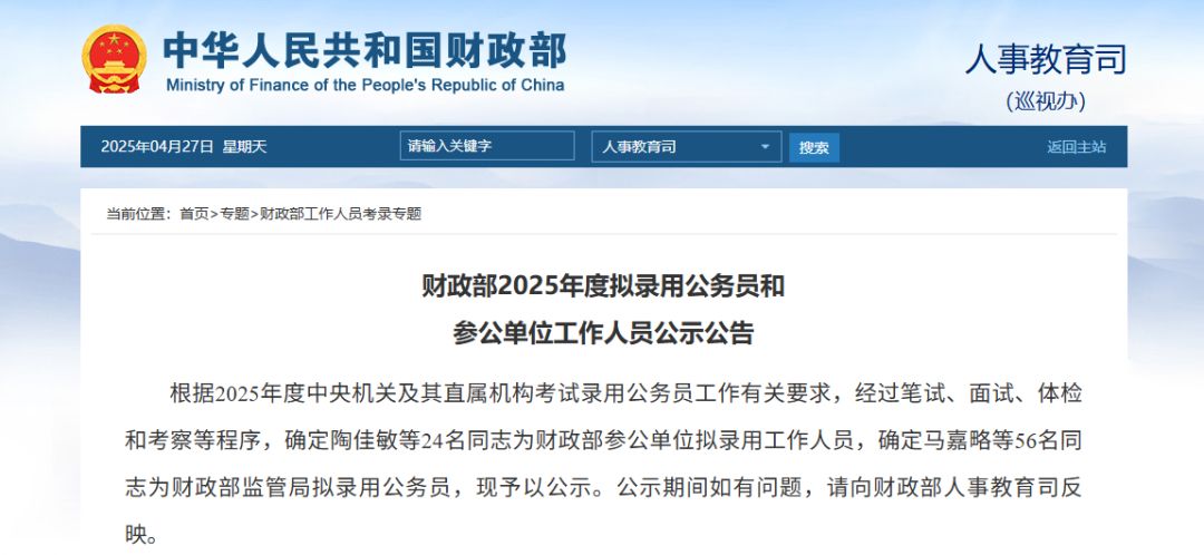 在财政部公布的2025年拟录用名单中,第一批拟录取人员共80人,其中有10人为留学生,毕业于英国、新加坡、中国香港、澳大利亚等地高校: