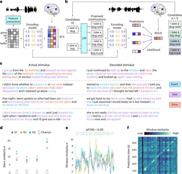 然后将参与者放回核磁共振成像机器中,并要求他们阅读不同的故事,或者在脑海中编造一个新故事然后解码器可以将核磁共振成像数据实时转换为文本,捕捉他们新故事的要点。