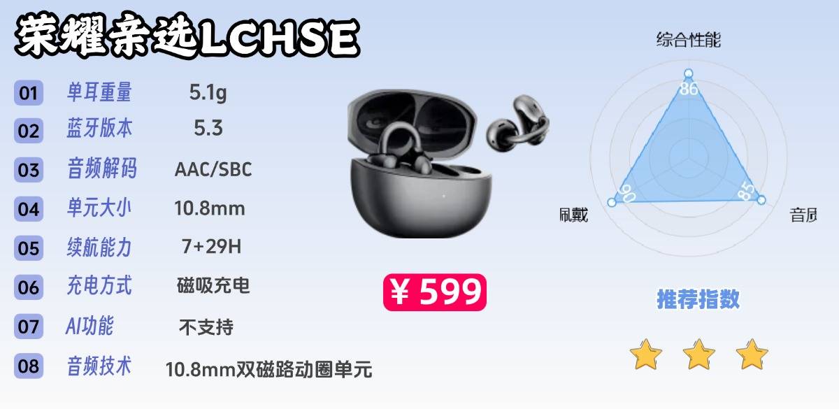 荣耀LCHSE耳机以现代设计语言诠释东方美学,外观灵感源自中式拱桥,外壳采用钛合金与耐磨PC复合材料打造,兼具轻盈质感与耐用性能。单耳仅重5.1克,佩戴几乎无感。
