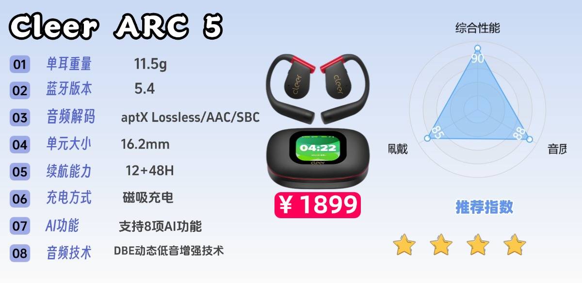 Cleer ARC5以AI智能体验为核心卖点,功能配置丰富全面。耳机采用耳挂式结构,耳挂部分选用医疗级硅胶材质,结合可伸缩、可旋转的双调节转轴,能够根据不同耳型灵活调整佩戴角度,有效提升贴合度与稳定性。单耳重量约11.5克,短时间佩戴轻盈舒适。