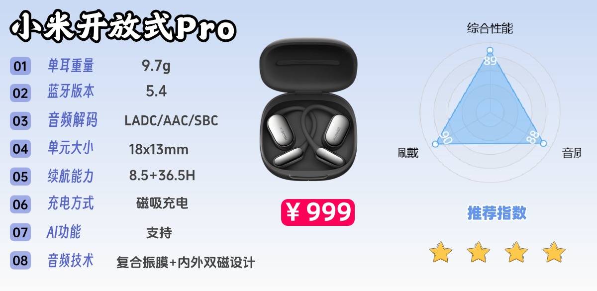 作为小米声学布局中的重磅新品,小米开放式耳机Pro延续了品牌一贯的高性价比路线,同时在硬件架构上实现了显著升级。产品创新性地采用五单元音频系统,集成了定制18×13mm超大动圈、双动铁单元以及压电陶瓷高音单元。