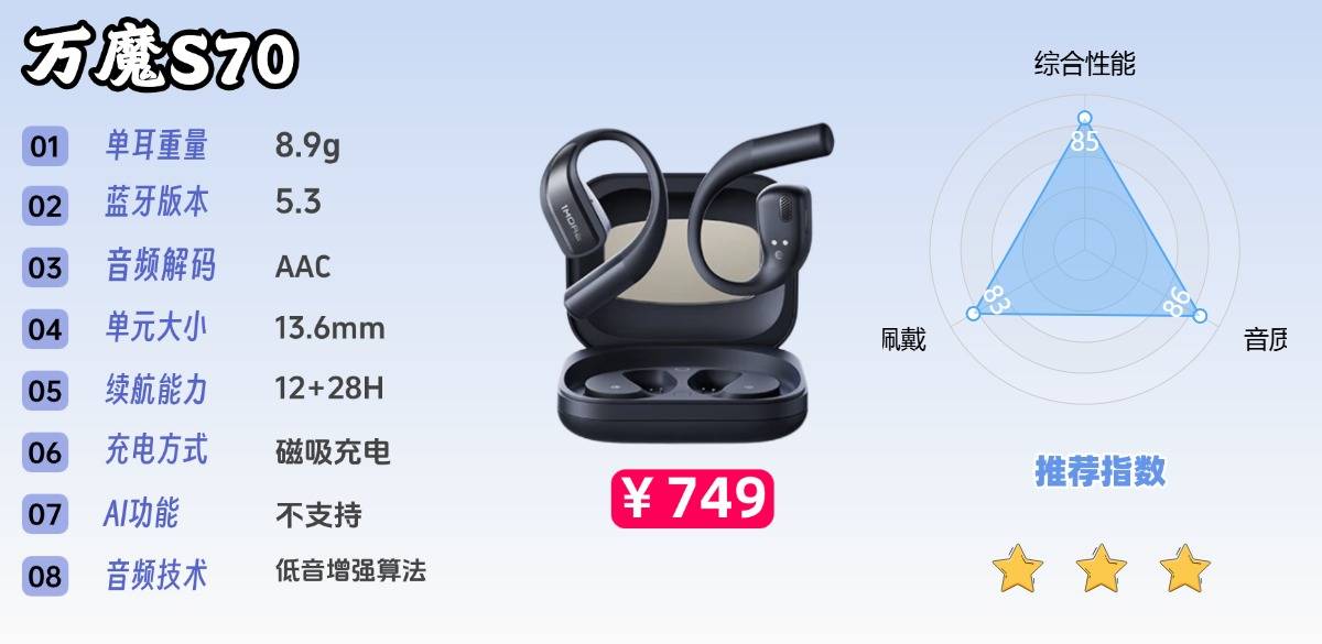 连接、续航和稳定性等方面表现均衡,功能设计以实用为导向。对于看重日常稳定连接、同时兼顾运动需求的用户而言,万魔 S70 是一款完成度较高、无明显短板的开放式耳机选择。