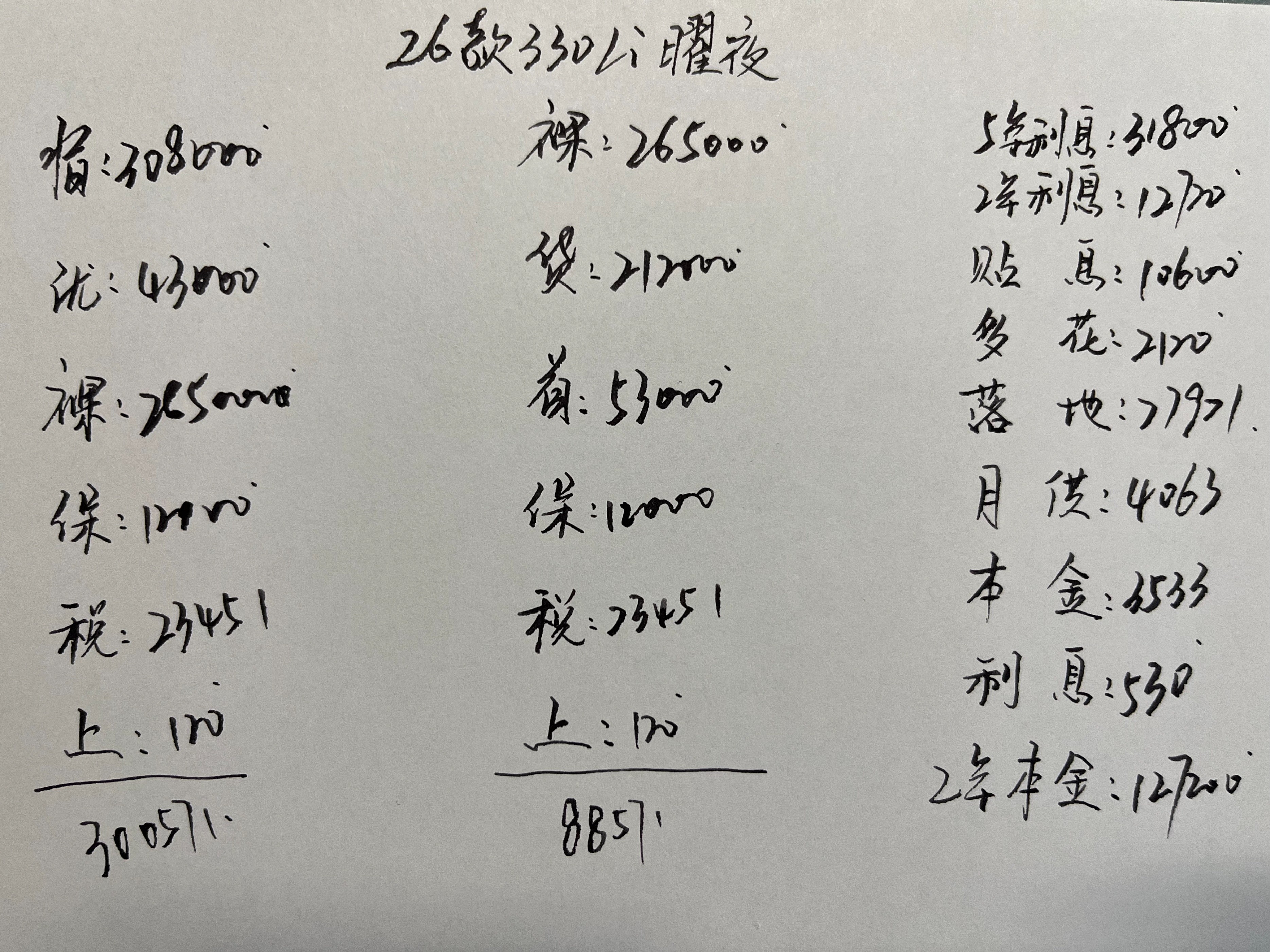 2026款宝马330Li 曜夜M运动套装的厂商指导价308000元,目前我所了解到的现金优惠43000元,车辆裸车价265000元,车辆购置税23451元,自己上牌120元就可以,全款落地参考价300571元。