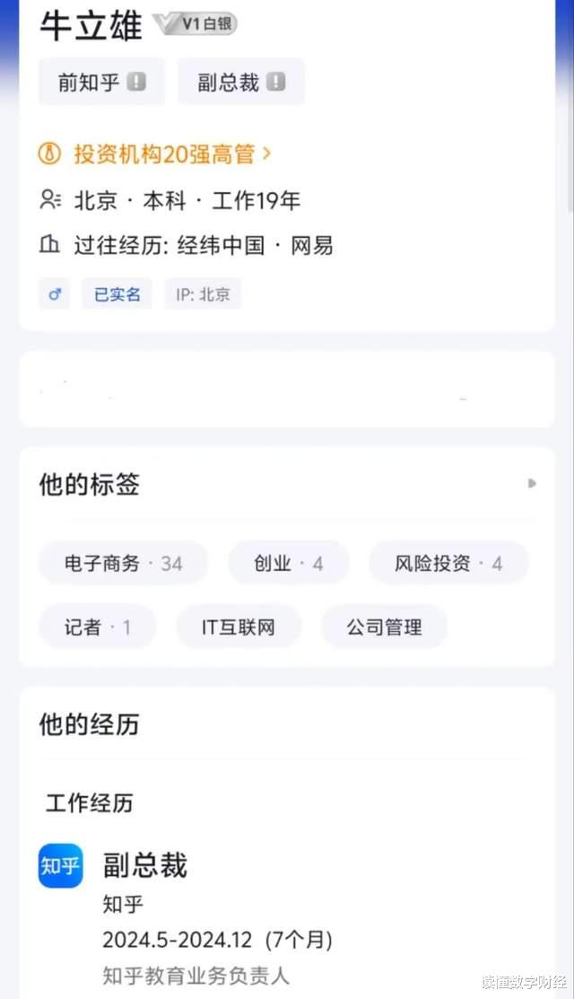 《读佳》获悉, 知乎副总裁牛立雄已离职,根据其在脉脉上实名的信息显示,在知乎任职的时间截止到去年12月,牛立雄同时也是知乎教育业务负责人。