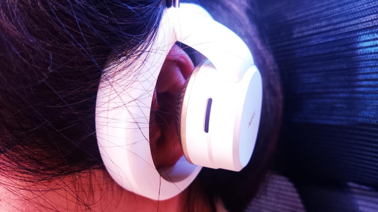 耳机采用Penta五点分压技术,通过头梁、耳圈上下缘、耳垫等多区域触点,将受力均匀扩散,从而减轻了各受力点的压力。看着笨重,但戴着却感受不到太大的压力。耳垫摁起来有点中空的感觉,非常柔软,不会挤压脸部。我经常在家戴着就出门了,走出老远才想起来忘了摘掉。在舒适度方面,体验比入耳式耳机强太多了。