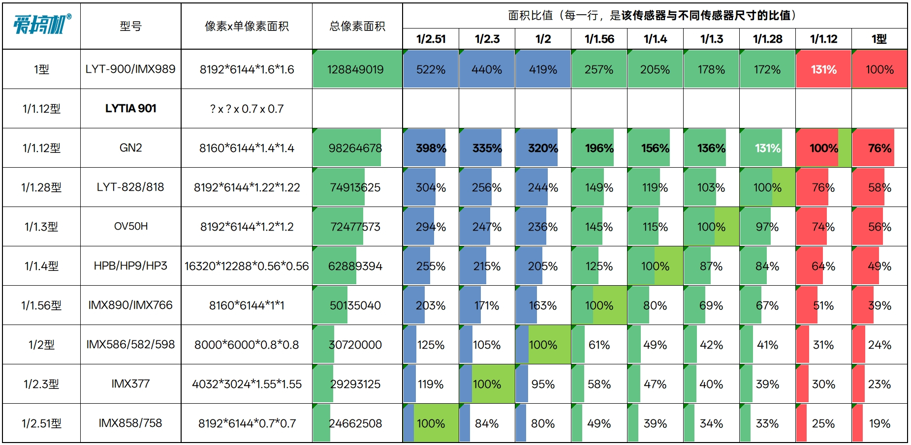 【LYTIA 901】(1/1.12型)的传感器面积,刚好夹在1型和1/1.28型正中间: