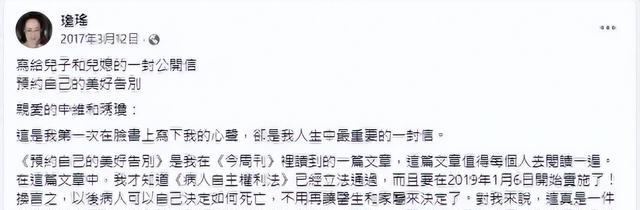 她表示无论生什么重病,她都不动大手术、不送加护病房、绝不能插鼻胃管,最后再次强调各种急救措施也不需要,只要让她没痛苦地死去就好。