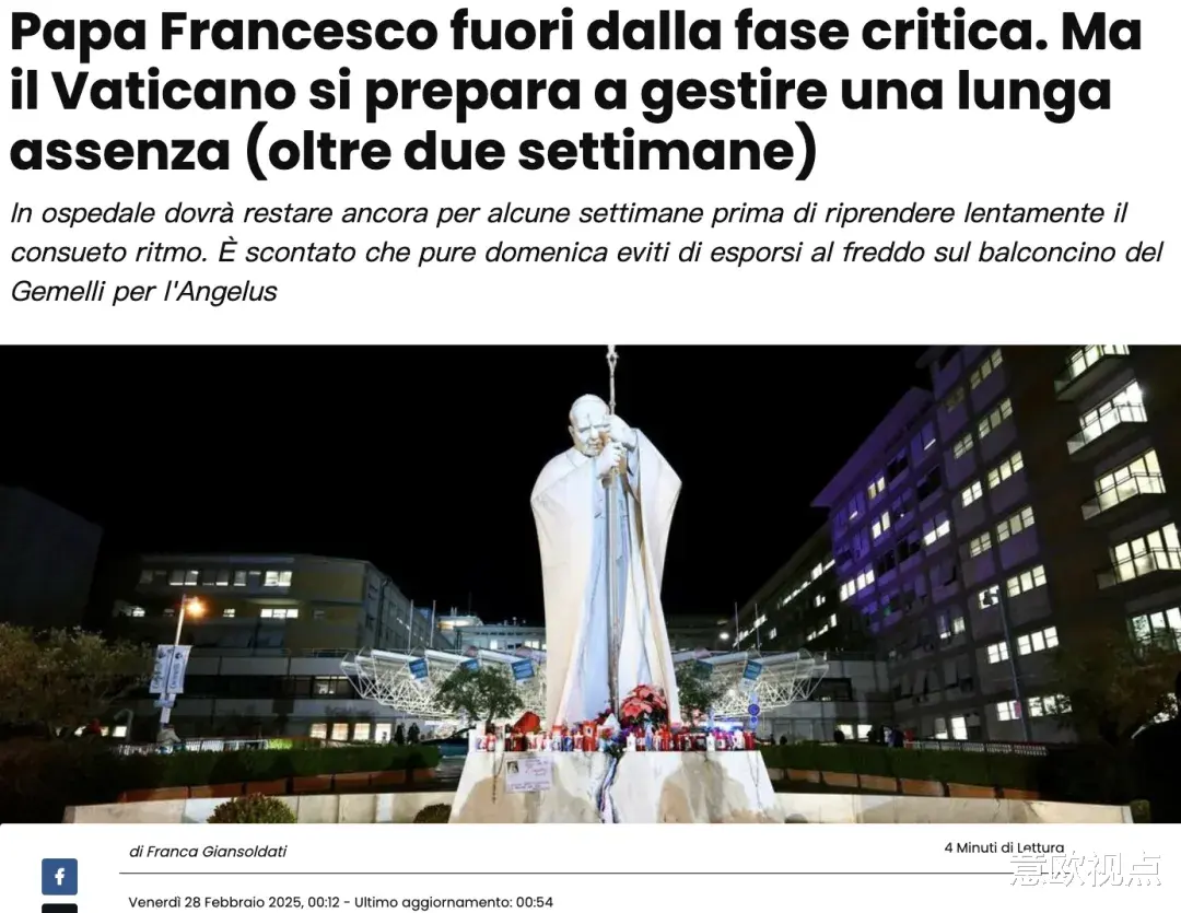 教宗方济各在经历两周肺炎治疗后已脱离危险期,但医疗团队确认其仍需住院数周以接受呼吸系统康复治疗。圣座正着手制定预案,应对教宗可能超过两周的公开活动缺席,这将成为现代教廷史上罕见的"常态化特殊时期"。