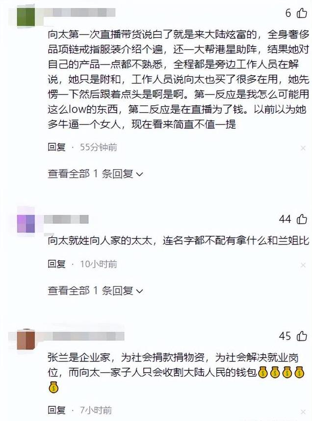 张兰的主要事业就是直播带货,而向太的事业重心更多是在实业,一直到2022年的时候向太也正式开始直播。