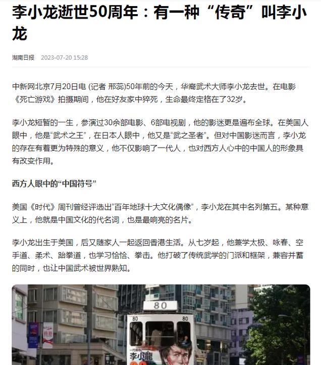 信息来源:湖南日报 2023年7月20日 关于《李小龙逝世50周年:有一种“传奇”叫李小龙》的报道