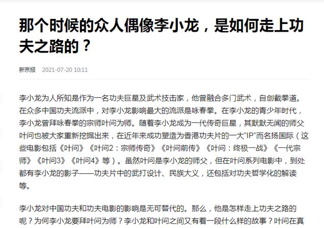 新京报 2021年7月20日 关于《那个时候的众人偶像李小龙,是如何走上功夫之路的?》的报道