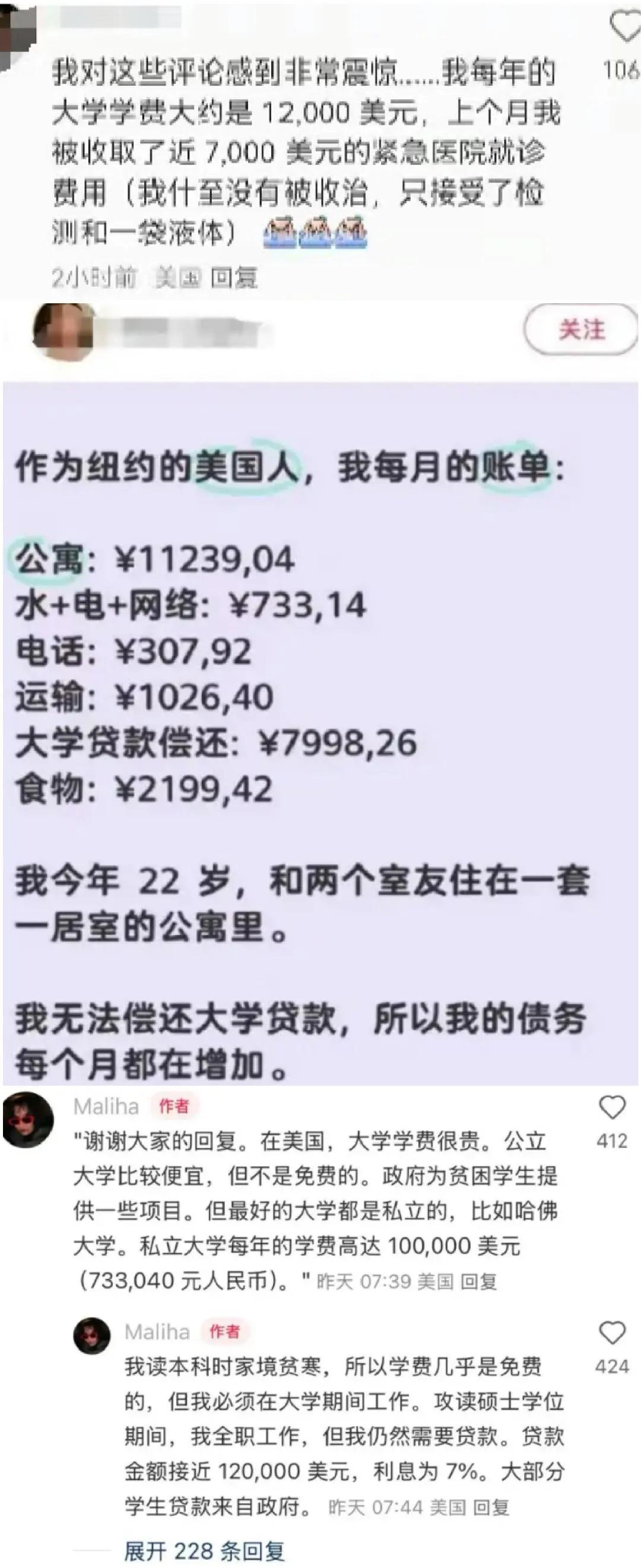 比如美国大学生破防了,通过他们的描述,这才知道原来他们的学费贷款还要利息,而且高达7%。而且他们大学的学费也是相当的贵,动不动就好几万美元,甚至十来万美元的都有。
