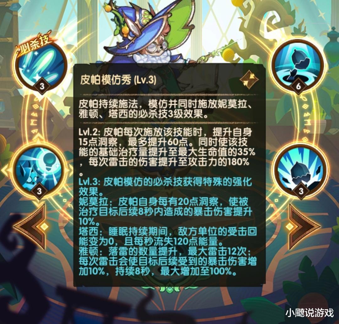 保留并调整了技能原有的模仿机制,更是她的核心亮点,复刻绿裔经典英雄必杀技的同时附加专属强化:治疗时为目标叠加暴伤增幅,实现治疗与增伤双效合一;睡眠控制时让敌方受击回能清零并持续流失能量,从根本上打乱敌方大招循环;落雷技能则叠加暴伤易伤,大幅提升团队对目标的输出效率。