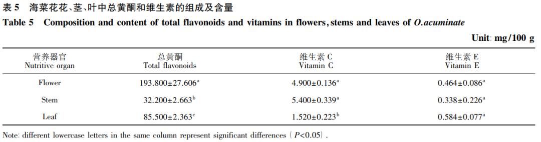 在维生素含量方面,海菜花茎的维生素C含量达5.400mg/100g,显著高于花(4.900mg/100g)和叶(1.520mg/100g),在三者中表现最优。