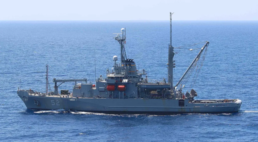 满载排水量3336 吨,搭载声呐扫描设备和动态定位系统,可在湍急洋流中精准锁定失事的船只和战机等目标的位置;船首配置了7.5吨级的吊臂,船尾则有40吨级吊臂。