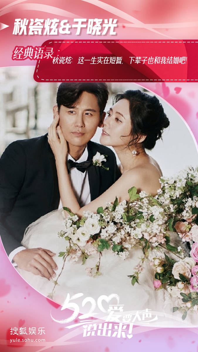 【秋瓷炫&于晓光:中韩夫妇的浪漫情话】秋瓷炫和于晓光的爱情跨越了国界,也感动了无数观众。在两人的婚礼上,秋瓷炫单膝下跪向于晓光求婚,深情告白:“和你一起走下去的这一生,我觉得实在短暂。如果可以的话,下辈子要不要也和我结婚?”