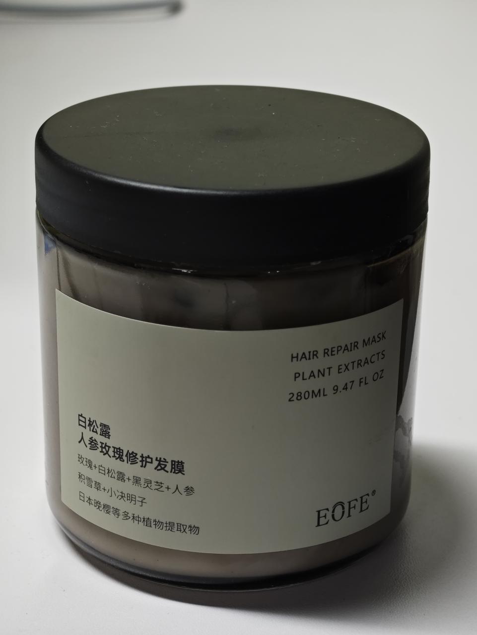这个牌子叫EOFE,算是比较小众的发护品牌,成立时间不长,主打植物成分和简约设计路线。包装风格确实能看出想走中高端路线,玻璃瓶身配黑色磨砂瓶盖,摆在浴室里高级感瞬间就有了。不过植物系品牌这几年很多,它家没有特别突出的记忆点,倒是白松露人参玫瑰这款发膜讨论度比较高。