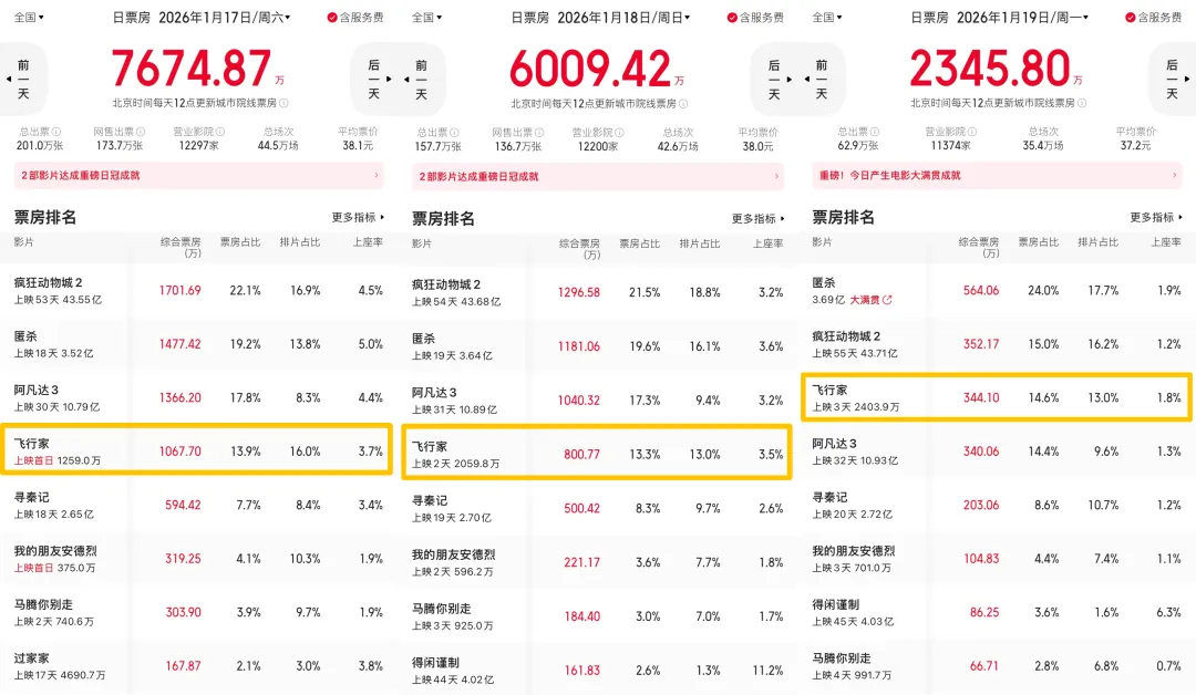 过去三天,《飞行家》的票房走势一路见好,仅次于12月“钉子户”《疯狂动物城2》《阿凡达3》和跨年档的《匿杀》,远远甩开同一天上映的《我的朋友安德烈》。