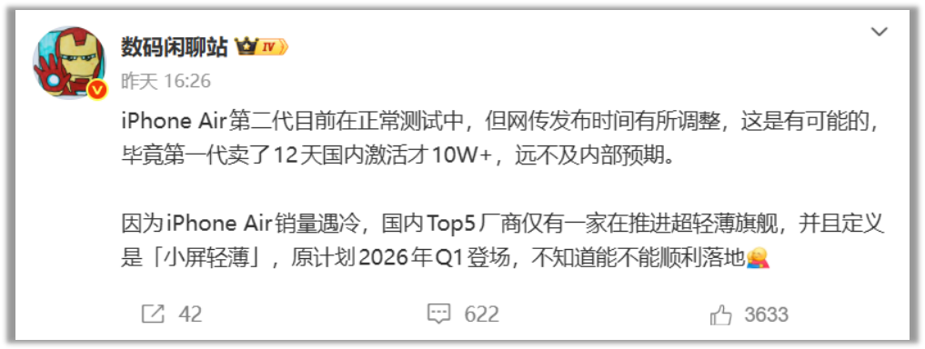 博主数码闲聊站透露消息:“iPhone Air第二代目前在正常测试中,但网传发布时间有所调整,这是有可能的,毕竟第一代卖了12天国内激活才10W+,远不及内部预期。因为iPhone Air销量遇冷,国内Top5厂商仅有一家在推进超轻薄旗舰,并且定义是「小屏轻薄」,原计划2026年Q1登场,不知道能不能顺利落地”
