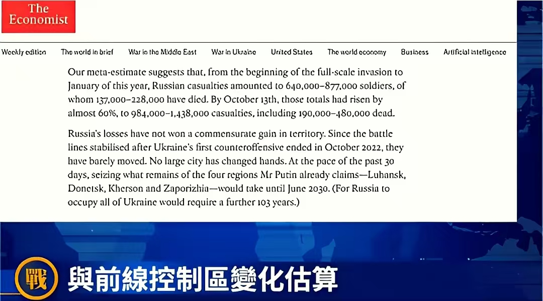 《经济学人》的测算表明,俄军正以“二战以来最惨烈”的代价,换取几乎可以忽略不计的领土收益。