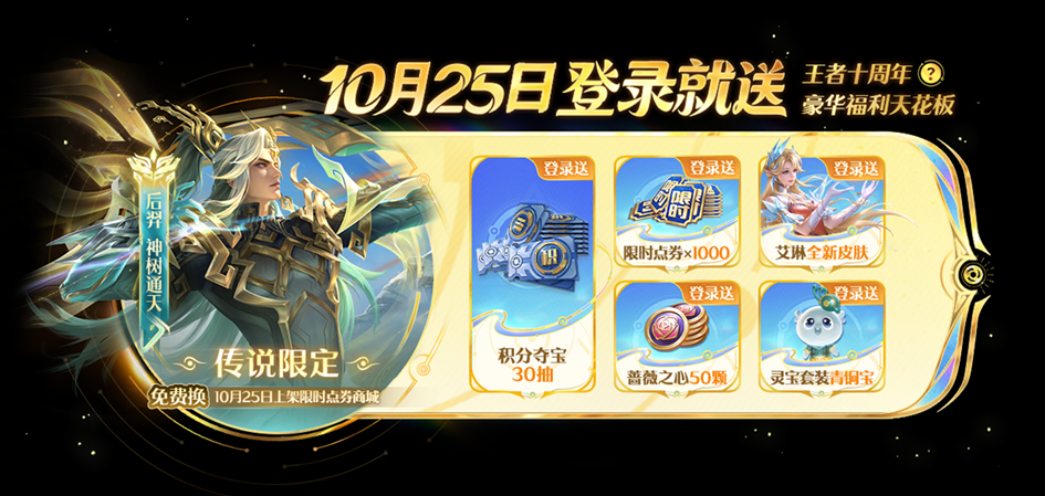 当然了,此次王者荣耀十周年庆中,六大福利登录领,玩家们应该知道了吧?没错,这六大福利只有在25号的时候开启,每个福利都是比较重要的。比如说后羿传说限定,是990限时点券兑换,积分夺宝券一共30张,蔷薇之心翻倍有50个,玩家们可以直接兑换珍宝阁的皮肤哦。另外,1000限时点券登录就能领取,艾琳的新勇者皮肤以及灵宝的青铜造型,全都是登录就直接领取的哈。不得不说,王者荣耀这次的十周年庆福利,还是可以的,估计25号当天日活要破亿了啊,你们认为呢?