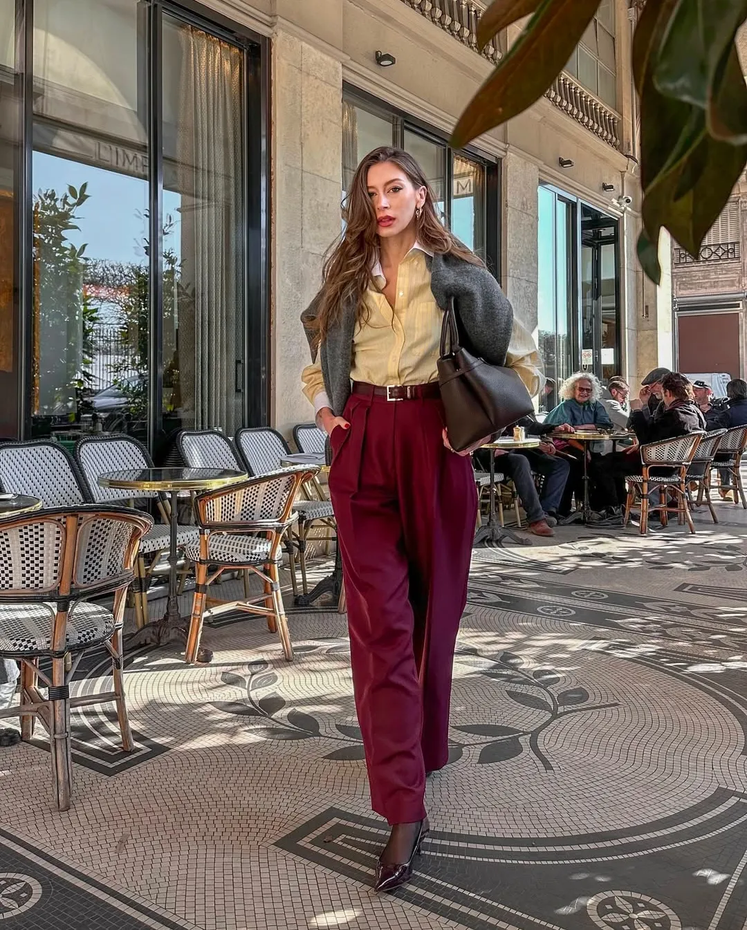 或者是当,黄色衬衣搭配红色阔腿裤时,一条灰色针织衫缓解浮夸气息,也是一种配饰的角色,尽显高级气质。