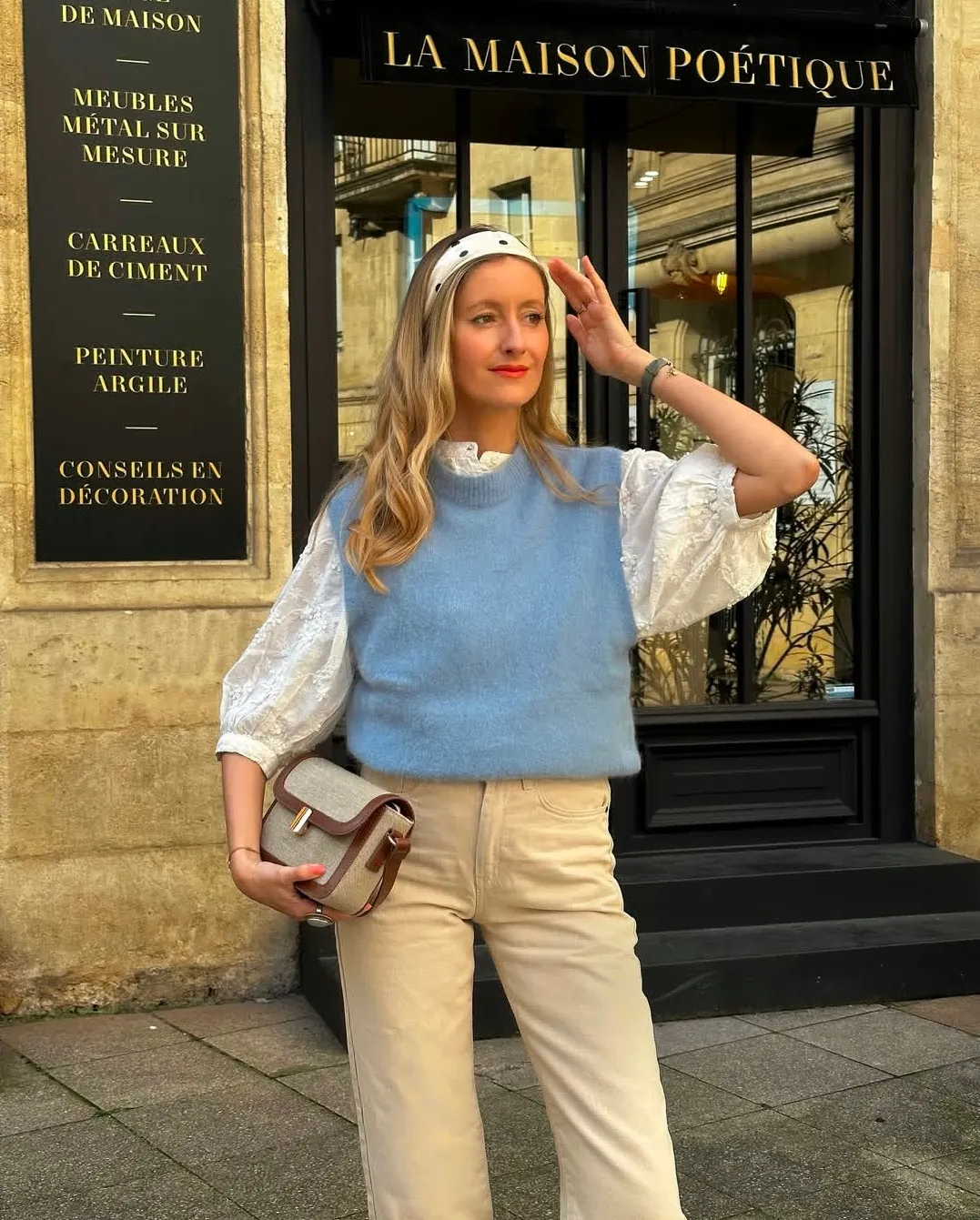 淡蓝色的针织马甲叠穿泡泡袖白衬衫,松弛自然散发着法式的浓郁风情,泡泡袖遮挡住大粗手臂的位置,帮你隐藏拜拜肉▼