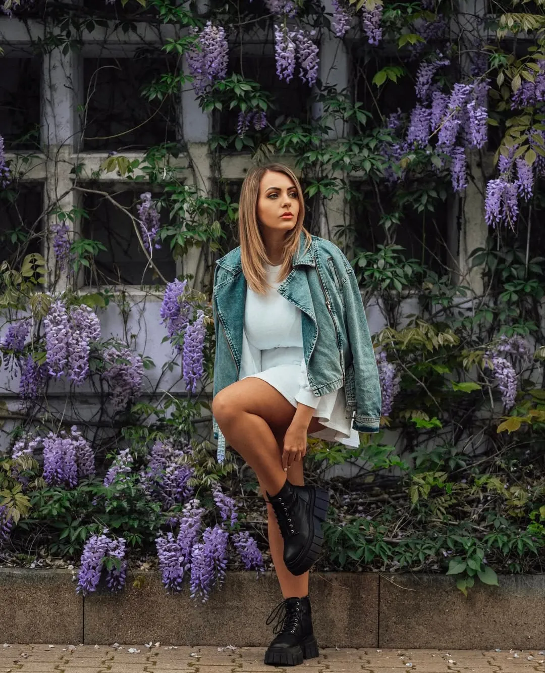 牛仔短外套与白色涟漪短裙搭配,牛仔的活力和白色的情形,加上黑色短靴的硬朗气质,氤氲出酷女孩的率性飒爽▼