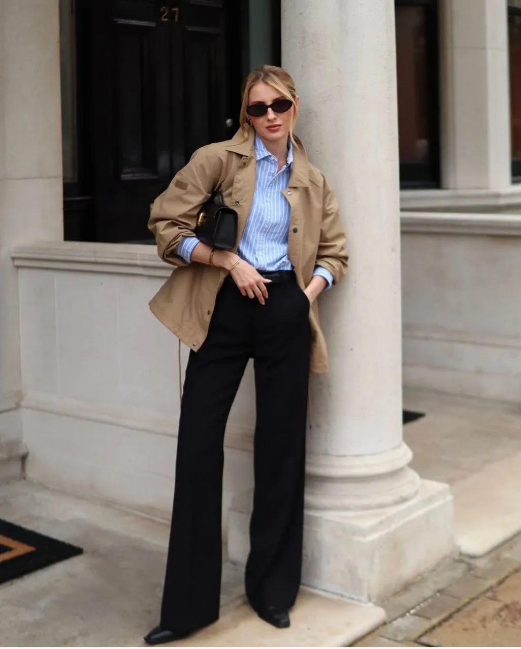 若是不喜欢耗费太多脑筋,建议“外套+衬衫”的叠穿方式,在温度和风度之间自由切换尺度,又轻松拿捏住鲜明的层次;棕色翻领外套叠穿蓝色条纹衬衫,又搭配黑色直筒裤,简约大方也不失时髦感▼