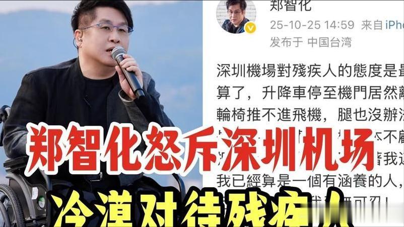 郑智化发帖在网上说,深圳机场对残疾人“最没人性”,这话一出来所有看到帖子的网友都在议论,要知道他可是公众人物,这话传出去会有不少人关注具体原因的。