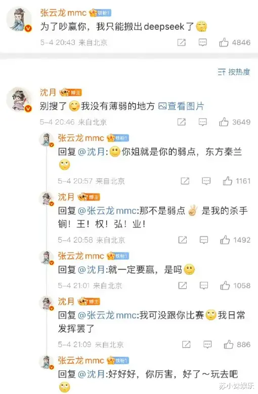 小苏去看了他们的吵架,别说还挺有意思。除了沈月和张云龙互怼外,作为姐姐的刘诗诗也加入了进来。刘诗诗从一开始力挺妹妹沈月,到后面受不了了,直接喊他们出去外面吵架。听话的2人,还真的去外面吵架了。