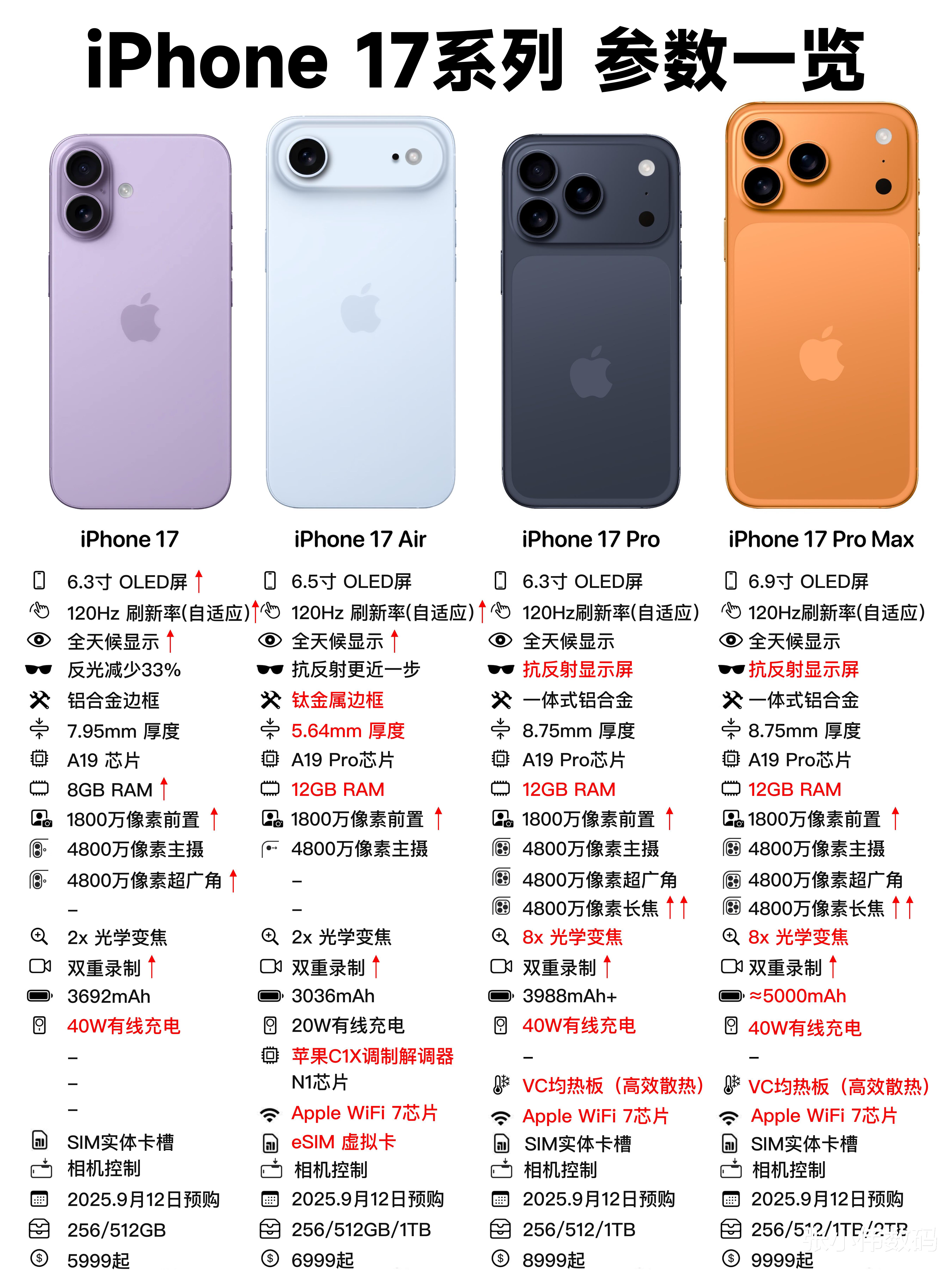 下面是 iPhone 17 系列的参数对比图,可以看下。