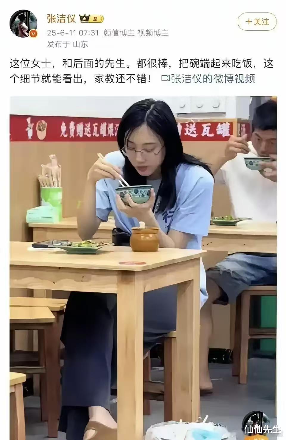 对此博主评价道:“这位女士和后面那位先生都很棒。把碗端起来吃饭,这个细节就能看出来家教不错!”