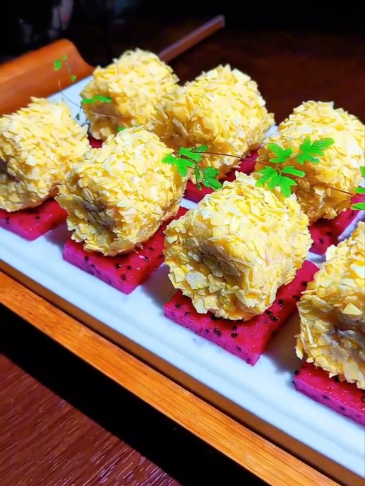③把裹满麦脆的香蕉,放在火龙果上,适当装饰一下,这道美食就做好啦。