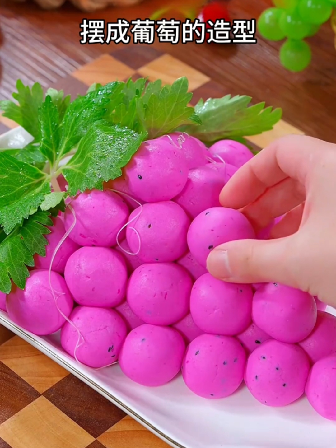 ③用手抓一小块,捏成圆形并摆放在盘中,记得要摆放得像一串葡萄一样的造型,之后放上几片菜叶,淋入桂花蜜,这道好看又好吃的美食就做好了。