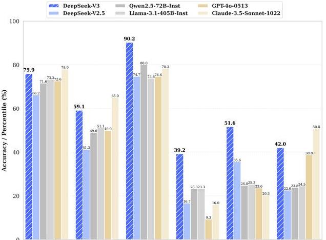 而且经过测评之后,V3模型的成绩超越了大多数的开源模型,甚至和世界顶尖的闭源模型不分伯仲。