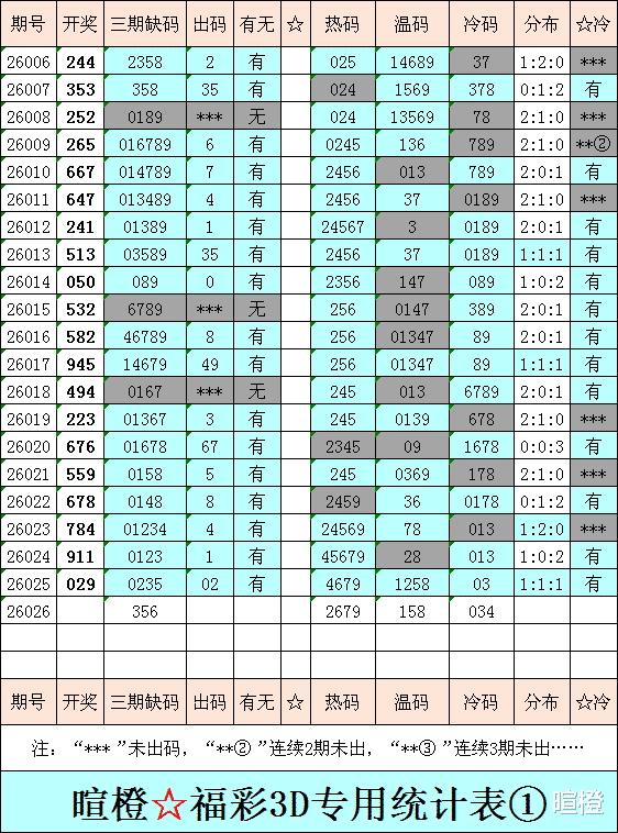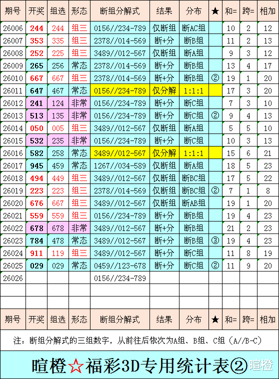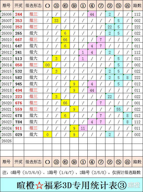 26026期:暄橙福彩3D综合条件(本期将在 1月26日21:15开)一、上期回顾 ☆1、上期开奖号:0 2 9。2、和值 = 11,跨度= 9。3、组六形态,002路组合。4、热度分布(热:温:冷)1:1:1。二、本期条件 ☆1、三期缺码:356。2、热:2679,温:158,冷:034。3、断组分解式:0156//234-789。4、四胆:2347;三胆:237。三、术语解释 ☆1、三期缺码:0至9这十个自然数当中,未在近三期开奖号出现的数字。2、热度(热温冷):自然数0至9,在近七期开奖号中,出现3次及3次以上的数字,称为热码;出现2次的数字,称为温码;出现1次和未出现的数字,称为冷码。某个数字在开奖号中出现几个,就按几次计算。3、断组分解式:将0至9这十个自然数,分成三组数字,从前往后依次为A组(4码)、B组(3码)、C组(3码),一般情况下,有一组数字不出码,偶尔会有两组数字不出码。A组不出码的情况相对较少。断组为主,分解为辅。4、常态组六号码:同时包含大数、小数、奇数、偶数、质数、合数的组六号码,共有72注。统计表中,简称“常态”。5、非常态组六号码:全大数、全小数、全奇数、全偶数、全质数、全合数等六种形态的组六号码,共有48注。统计表中,简称“非常”。★提醒:彩市有风险,参与须谨慎!水平有限,仅供参考!