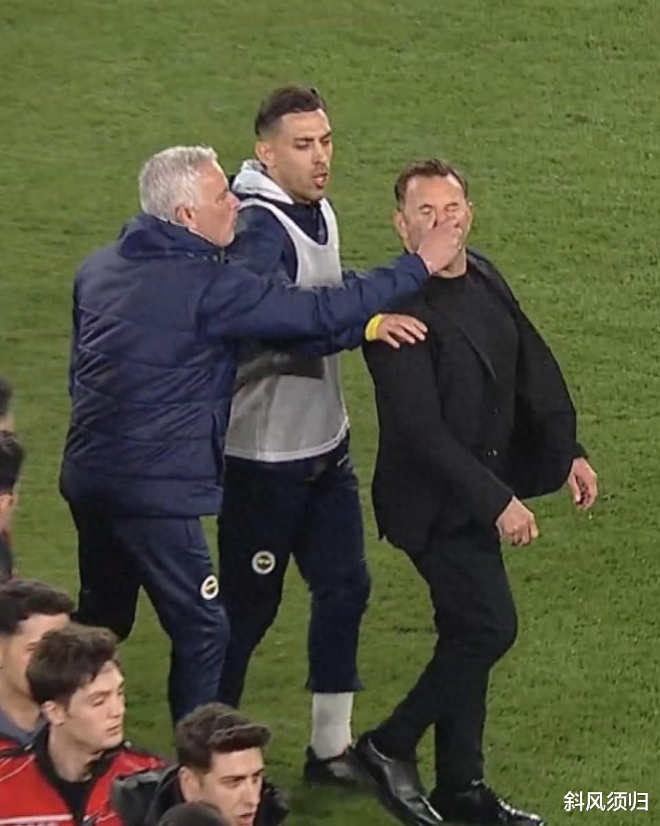 终场哨声响起,加拉塔萨雷凭借奥斯梅恩的梅开二度,将比分定格在 1 - 2,费内巴切主场落败,无缘四强。穆里尼奥再也压抑不住心中的怒火,他径直朝着裁判走去,想要讨一个说法。就在他与裁判理论的过程中,加拉塔萨雷的主帅布鲁克凑了过来,对着裁判说道:“别听他的,你吹得很好。” 不仅如此,布鲁克还用英语对着穆里尼奥说出了侮辱性的话语。穆里尼奥听到这些话后,瞬间被彻底激怒。他毫不犹豫地伸手捏住了布鲁克的鼻子,布鲁克马上夸张性的倒地。这一突如其来的举动,让在场的所有人都惊呆了。双方的教练组成员和球员们纷纷围了过来,现场顿时陷入了一片混乱。裁判见状,立刻向穆里尼奥出示了红牌。而愤怒的穆里尼奥根本没有理会裁判的判罚,他转身径直走回了更衣室,拒绝出席赛后的新闻发布会。