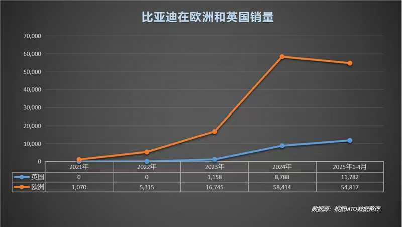 纵观比亚迪在欧洲整体的销量发展,2021年比亚迪刚进入欧洲时,年注册量仅有1000多台。到2024年,比亚迪在欧洲的注册量已大幅攀升至近6万台,增长近60倍!进入2025年,其增长态势更是持续攀升,1~4月销量已达约5.5万台,已接近2024全年水平,且仍处于高速增长阶段。在英、法、德、意、西等主要市场中,英国的增长尤为突出,今年1~4月销量突破1万台。