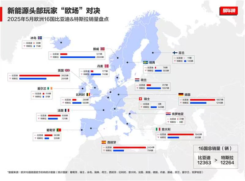 根据易车榜数据显示,2025年5月,比亚迪在欧洲16国总销量再次超越特斯拉,其中,在英、法、德、意、西五大市场中,比亚迪总销量为10199辆,以6619辆的领先优势,大幅抛离特斯拉。